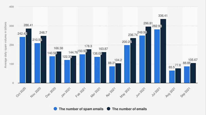 Steer Clear of Spam: A report from Statista.Com reveals that in the period between October 2020 and September 2021, global daily spam volume peaked in July 2021, with an astonishing 283 billion spam emails out of a total of 336.41 billion sent emails. Notably, the United States was the leading sender of these emails.