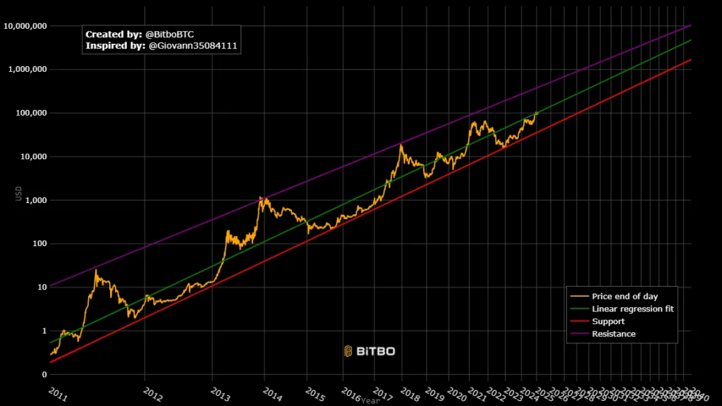 In the long term, if the broader acceptance of Bitcoin continues, bitcoin power law predictions suggest a gradual rise in value, especially as supply constraints become more pronounced due to the capped maximum supply of 21 million coins. Analyzing various scenarios through this lens helps investors to navigate the complexities of market dynamics and make judicious choices. Therefore, while future fluctuations are inherently uncertain, leveraging power law predictions enhances strategic investment approaches within the realm of cryptocurrency. Figure 1.0 below illustrates the Bitcoin Power Law Growth Model, which highlights Bitcoin’s price movement over time within a logarithmic scale. This model uses a linear regression fit (green line) to capture Bitcoin’s long-term growth trend, bounded by support (red line) and resistance (purple line) levels. These boundaries form a “power-law corridor,” showing how Bitcoin’s price oscillates predictably within these limits over the years. The model suggests that despite short-term volatility, Bitcoin’s price adheres to a long-term exponential growth trajectory, as depicted by its adherence to the corridor since 2011.